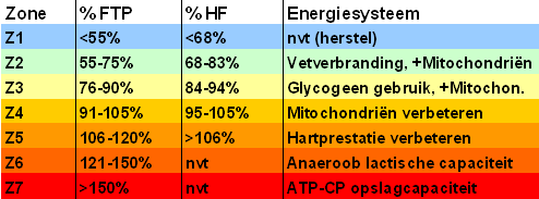 Bepaal wat je wilt bereiken, train in de juiste zones en boek optimaal resultaat. De trainingseffecten die je verwezenlijkt verschillen per trainingszone. Door inspanning (trainingsprikkel) in een bepaalde trainingszone vertoont het lichaam een voor die zone specifieke fysiologische reactie waarbij fysieke eigenschappen of het vermogen van bijbehorend energiesysteem veranderen (idealiter verbeteren). De tabel hieronder geeft weer hoe de zones waarin getraind wordt te onderscheiden zijn en welk effect training in die zone heeft.
